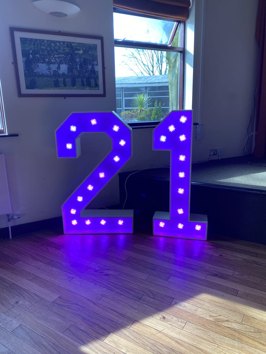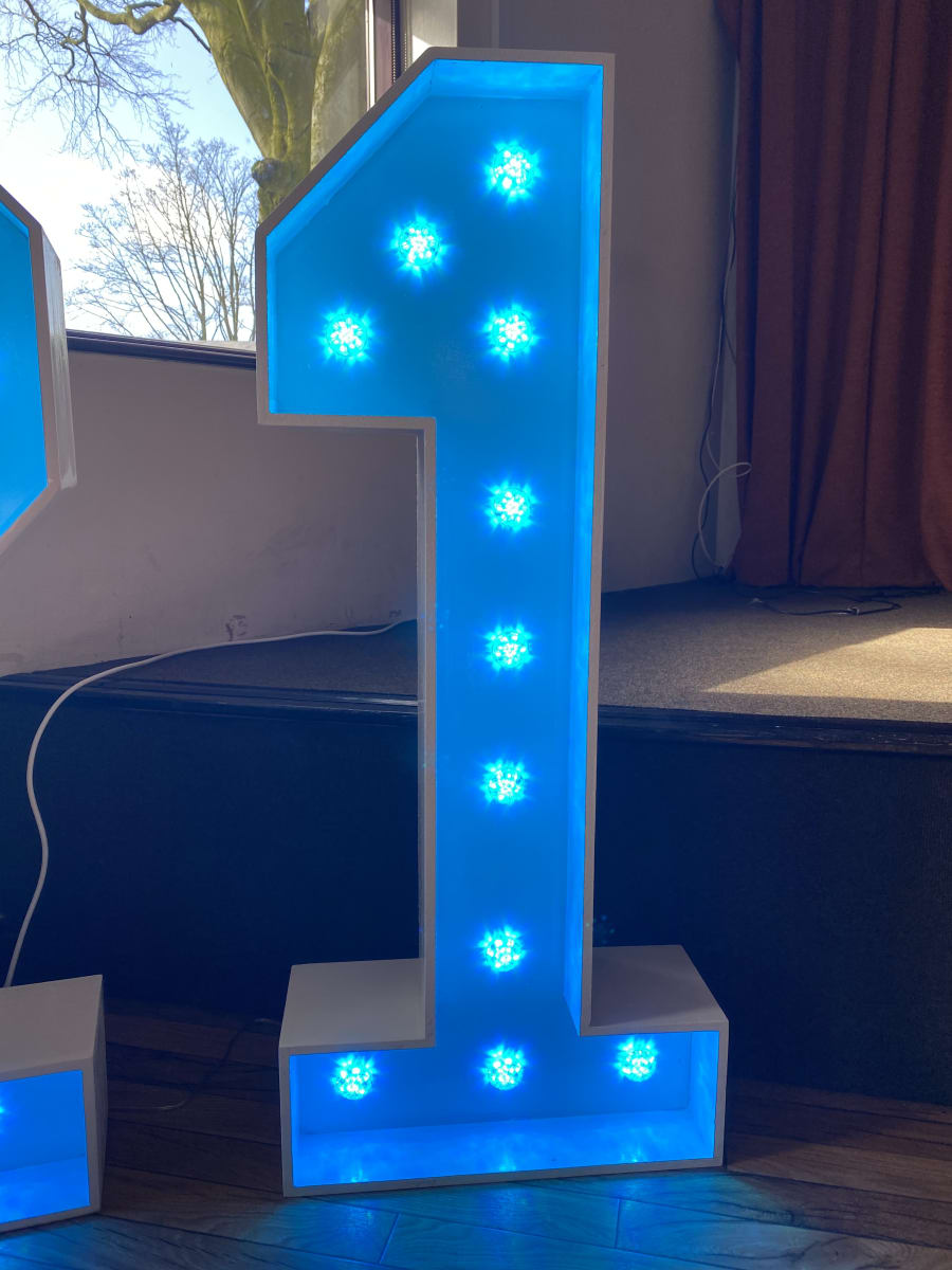Why not add our amazing colour changing number 1 to brighten up your birthday, anniversary, Business birthday or any other event you would need a number for. They are controlled via a tablet that is provided by us for you and you will be shown how to use by a member of our team. it can be set to any colour or set to different programs including light chase