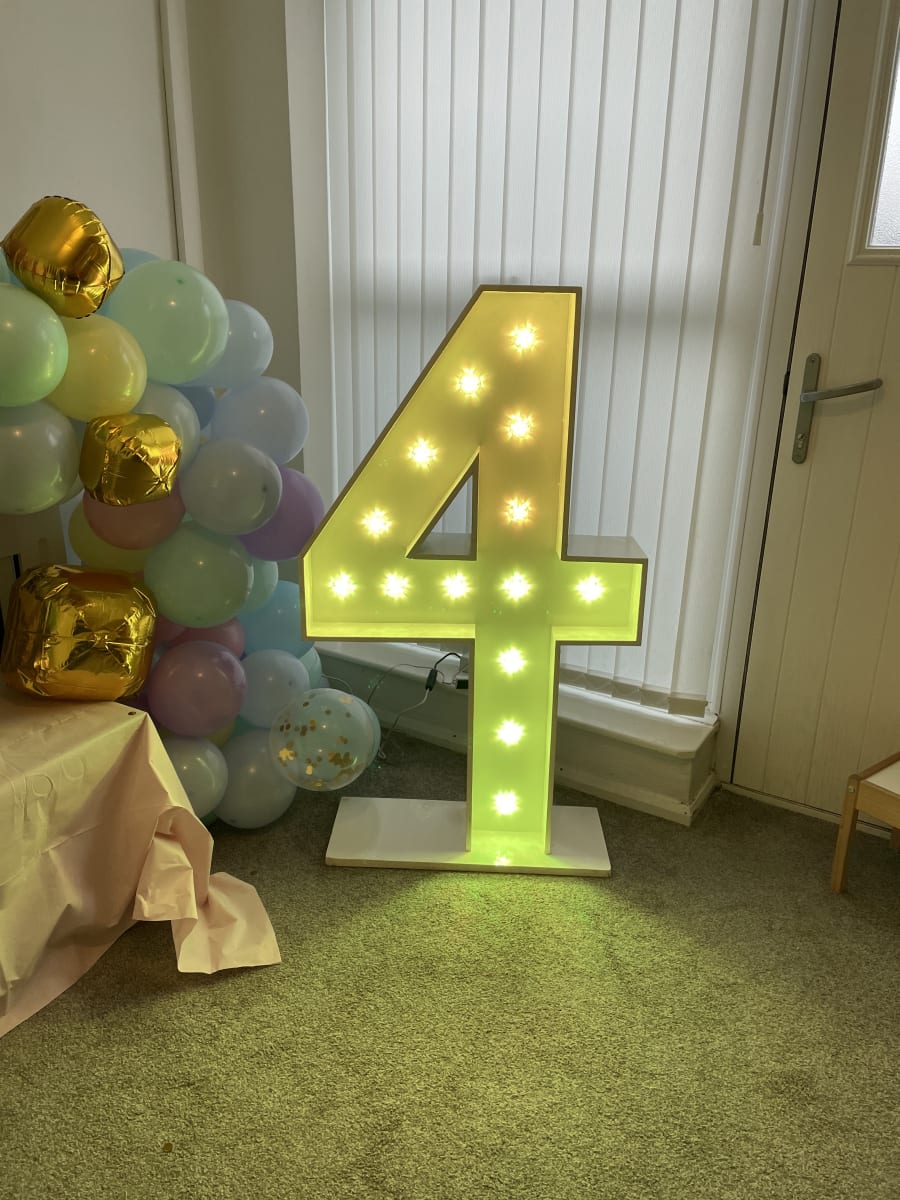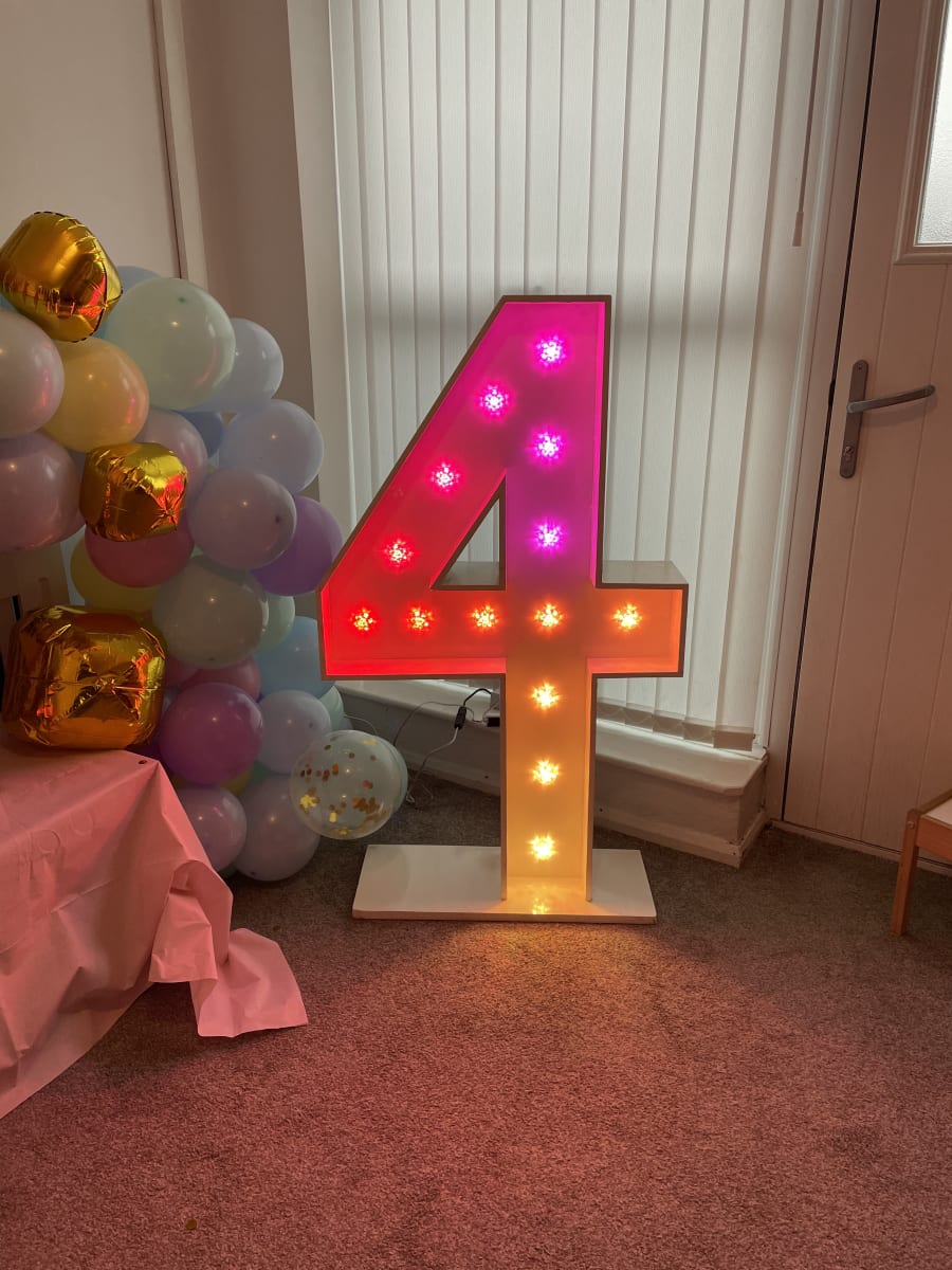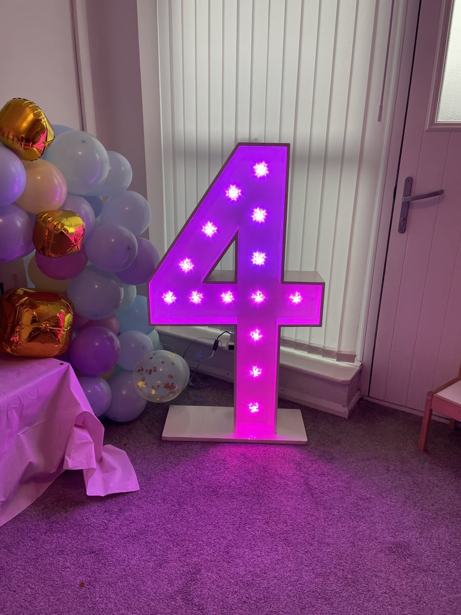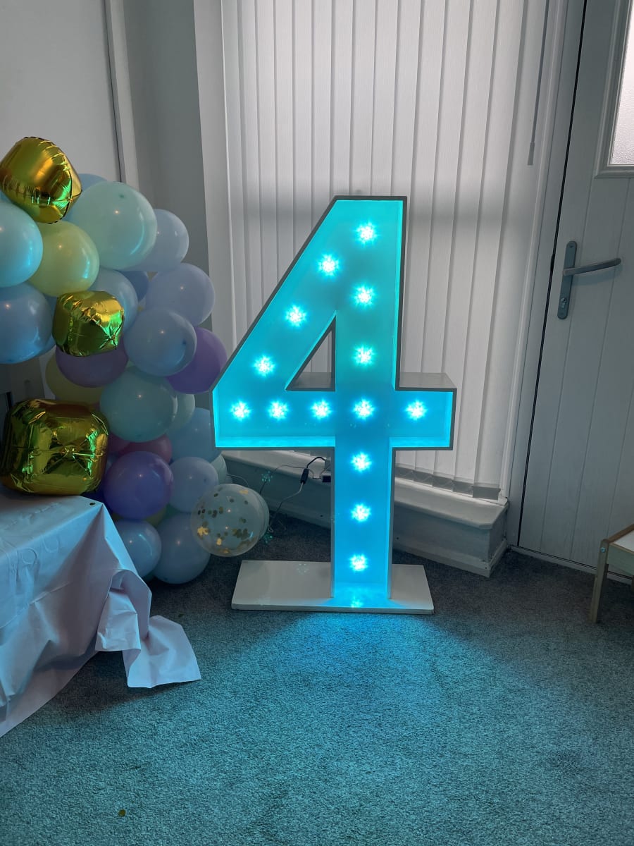 Why not add our amazing colour changing number 4 to brighten up your birthday, anniversary, Business birthday or any other event you would need a number for. They are controlled via a tablet that is provided by us for you and you will be shown how to use by a member of our team. it can be set to any colour or set to different programs including light chase