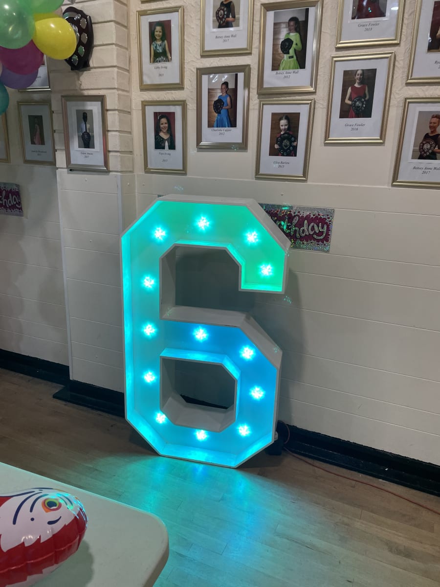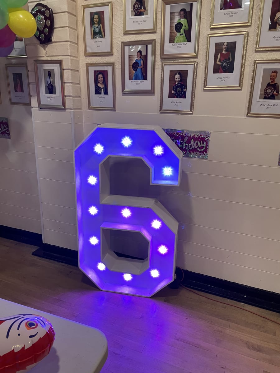 Why not add our amazing colour changing number 6 to brighten up your birthday, anniversary, Business birthday or any other event you would need a number for. They are controlled via a tablet that is provided by us for you and you will be shown how to use by a member of our team. it can be set to any colour or set to different programs including light chase