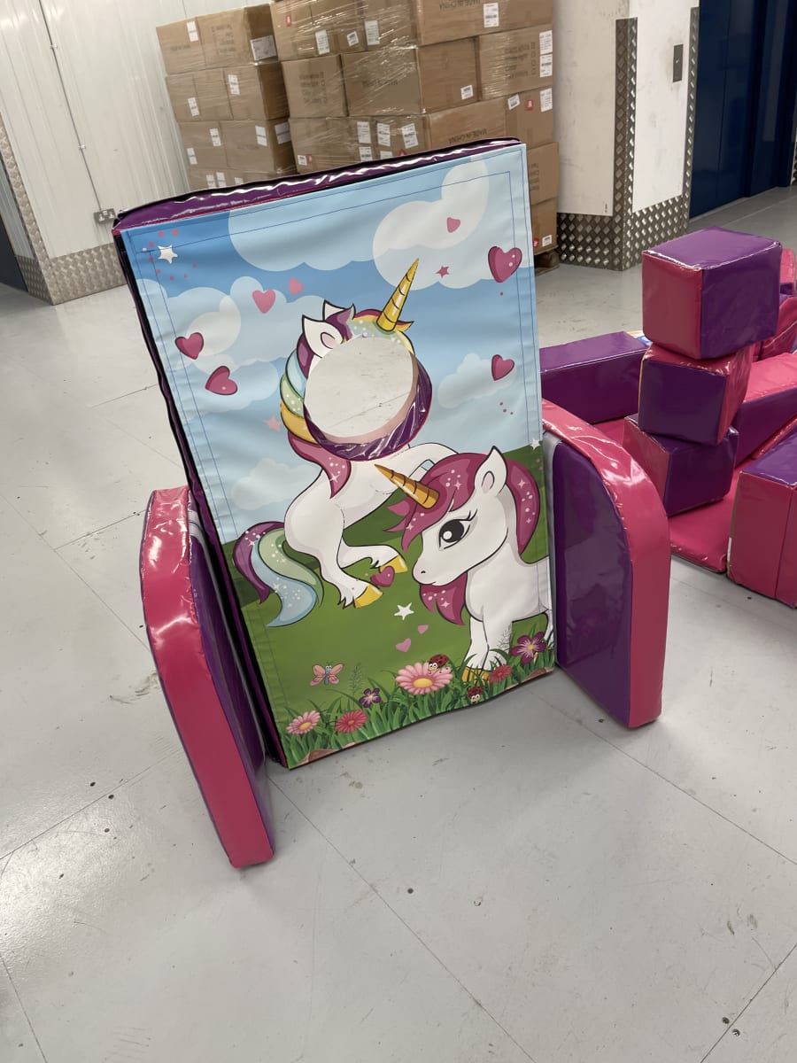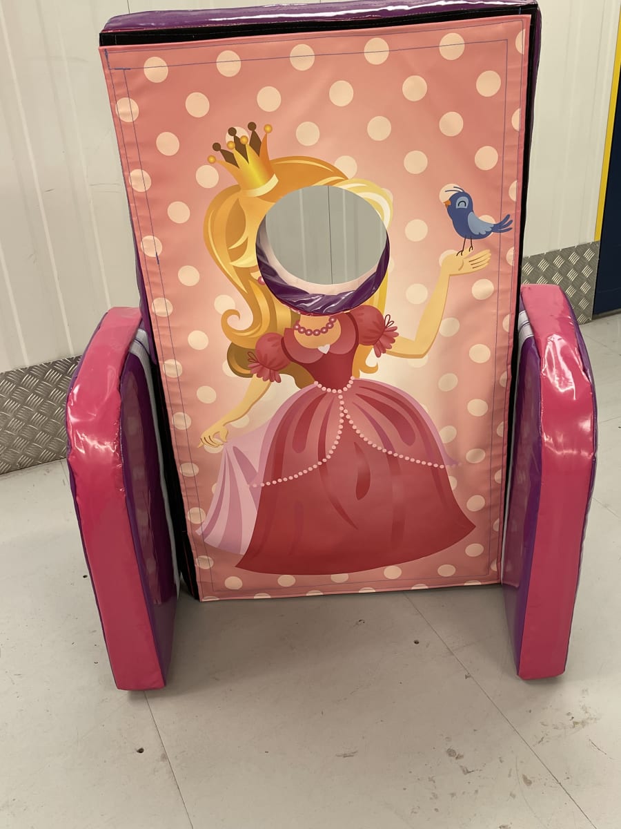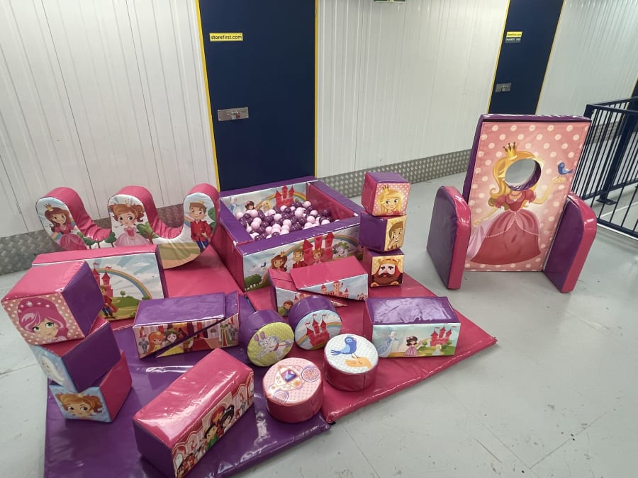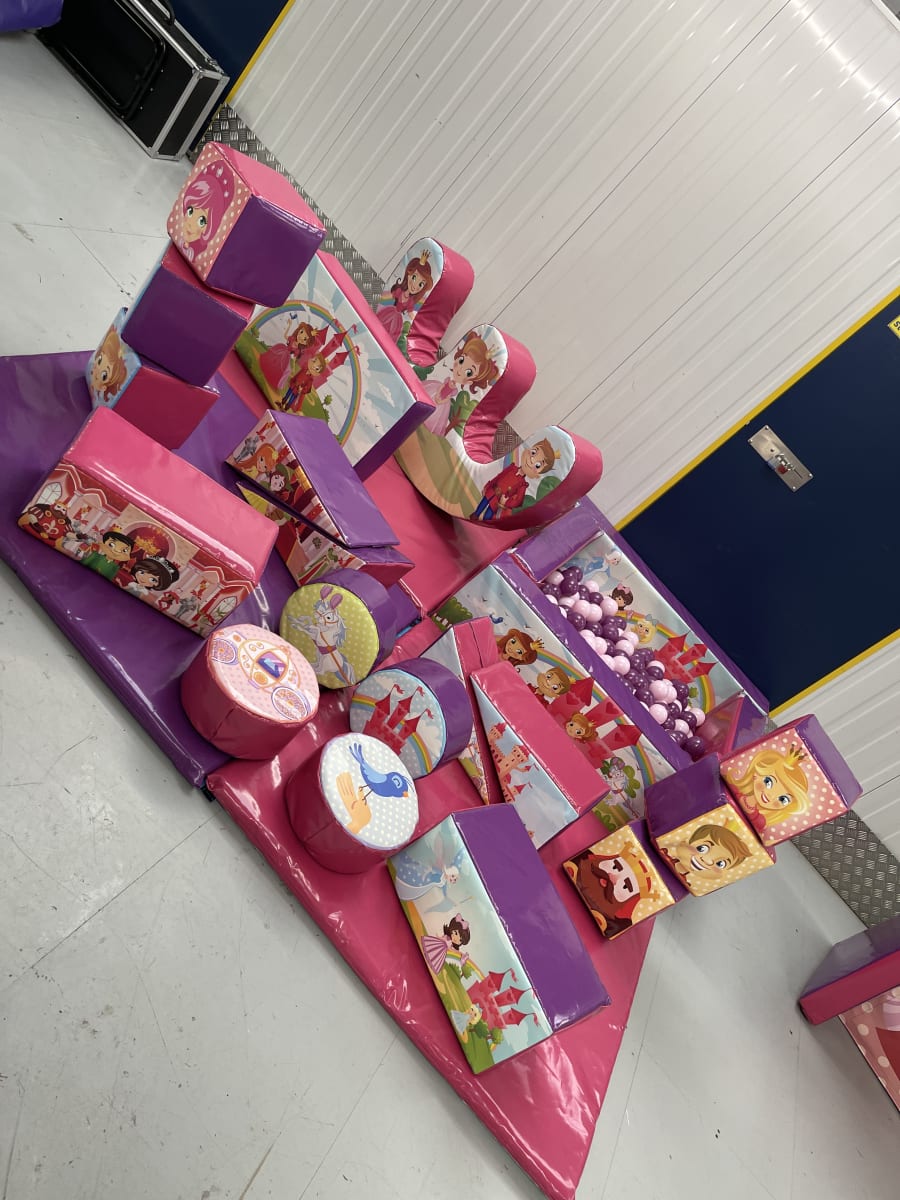 our amazing princess soft play comes with 17 large foam pieces a large rocker all with bright graphics and a ball pool full of ball and a peek a boo bored .